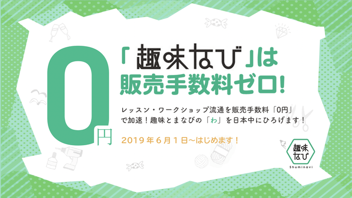 趣味なびでは、2019年6月よりスキルシェア市場では異例となる販売手数料完全無料へと変更させていただきます。スキルシェア市場においては、通常主催者・出品者には一定の販売手数料や月額利用料が課金される仕組みとなっております。趣味なびも、2018年5月より開始した「コト体験」のマッチングサービスでは、販売手数料を25%とさせていただいておりました。しかし、より多くのお客様に参加して欲しいという主催者側の意向と、より気軽にワンタイムレッスンやワークショップに参加したいという参加者側の意向にお応えするため、この度、販売手数料を無料にすることを決定いたしました。なお、従前通り月額費用や掲載料は無料となります。これにより、主催者側は販売額を全て売上とすることができるため、販売価格を下げても売上を確保することができ、参加者側は最安値でワンタイムレッスンやワークショップを購入(参加)することが可能となります。