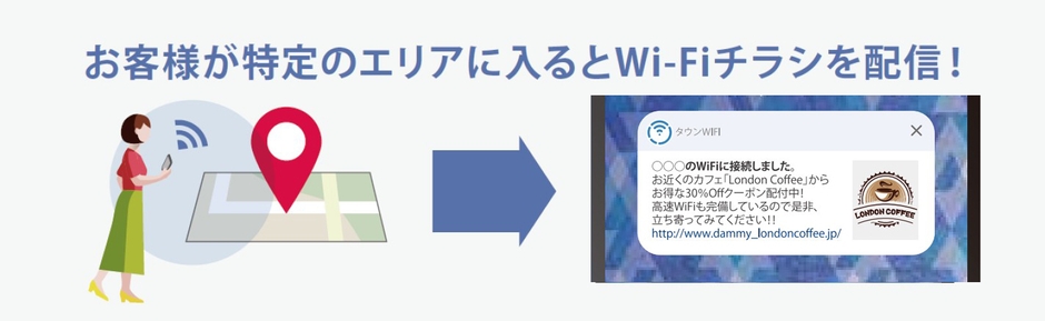 タウンWiFiアプリを利用しているユーザー500万人に対し、クーポン等のお得な情報をチラシとして配信できる集客ツールです。 ユーザーが店舗周辺のWi-Fiに接続したタイミングや、特定のエリアに入ったタイミングでスマホのプッシュ通知でチラシを表示し、来店を促進します。また、実際に来店すると自店舗のWi-Fiに接続されるので、チラシを受け取ったユーザーの来店を検知することも可能です。