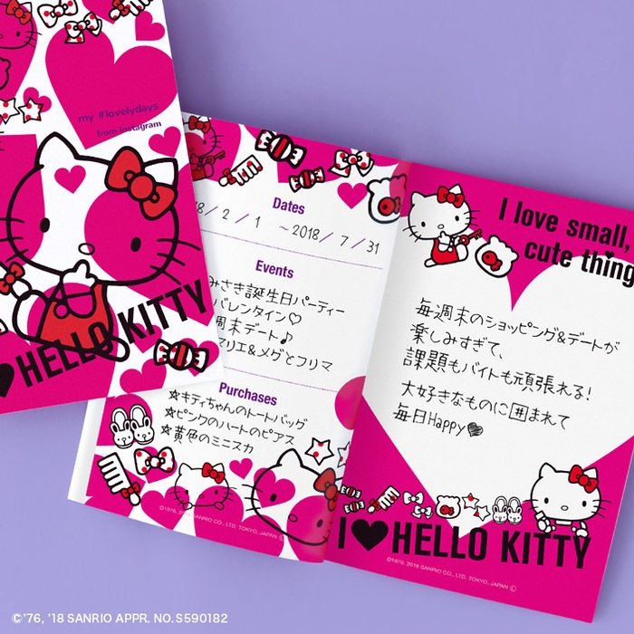 キティちゃんが大好きな小物と、ピンクのハートが散りばめられたHOTなデザイン。同様に、巻頭に入る見開きのオリジナルテンプレートにもピンクのハートがぎっしり。左ページは参加したイベントやショッピングでGETしたアイテムを書き込める記入欄、右ページは大きなハートのフリーメモ欄です。
