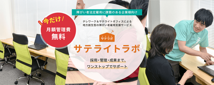 「サテラボ」のご利用につきまして、2020年9月30日までに利用開始していただきますと、トライアル期間の割引サービスとして導入から6ヶ月間、管理費無料にてご提供いたします。障がい者雇用をはじめてされる企業様でもわかりやすく、かつバックアップも万全です。多様性を求められる現代は、雇用や働き方に企業の姿勢が問われる時代です。この機会に「サテラボ」のご利用で障がい者雇用を実現していただきたいと考えております。