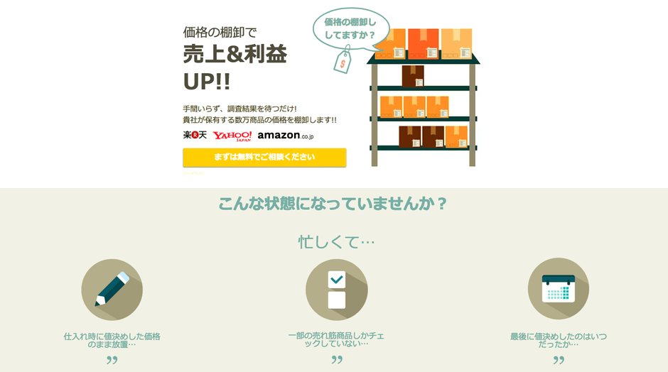 インターネット上(価格.com、楽天市場、Yahoo!ショッピング、Amazon.co.jpなど)の価格を自動調査、自動価格更新ができるサービスです。