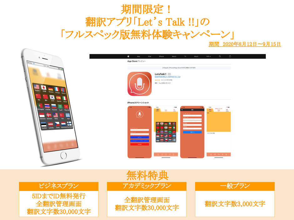 Webシステム・アプリ開発を行うイーデパ・ワールド株式会社(本社:東京都福生市、代表取締役:井梅 光人)は、2020年8月12日から同9月15日までの1ヶ月間、25言語翻訳アプリ「Let's Talk!!」において、ビジネス・アカデミックプランにお申込みいただいた先着100社・100名様に翻訳履歴管理ページと翻訳文字30,000文字、一般プランにお申込みいただいた先着100名様に翻訳文字3,000文字をプレゼント。「フルスペック版無料体験キャンペーン」をご提供いたします。