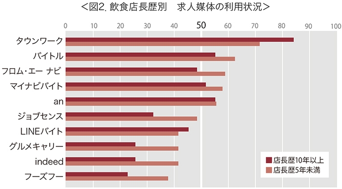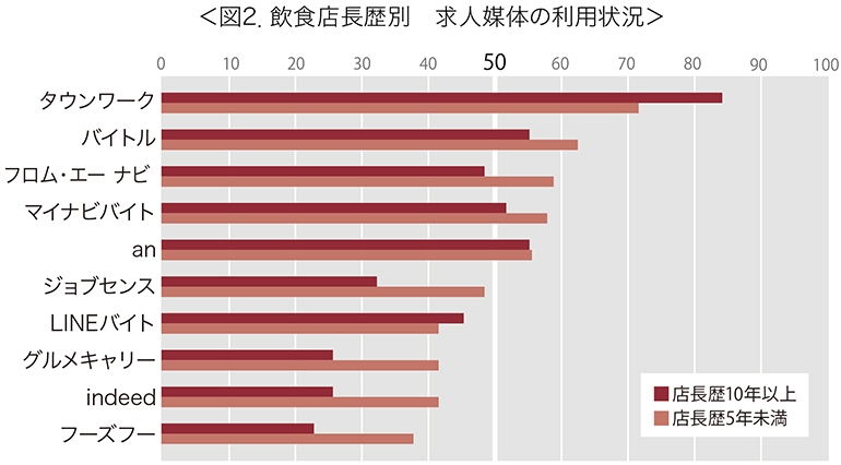 店長の経験年数によって利用する媒体の傾向が違うことも分かりました(図2.飲食店店長歴別 求人媒体の利用状況)。経験10年以上の店長は、タウンワークの利用度が断トツ。2~5位にメジャー媒体が並び、6位以下はLINEバイトを除いて総じて利用度が低いという傾向。一方で経験5年未満の店長は、6位以下の新興媒体利用が高く、特に8位以下のグルメキャリー、indeed、フーズフーはほぼ経験5年未満の店長のみが反応しているという結果になっています。