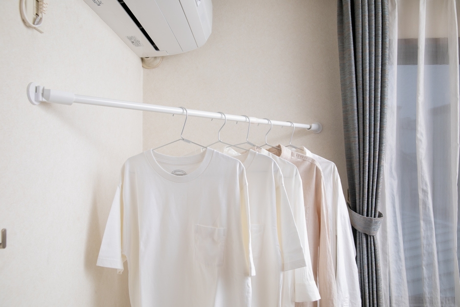 お部屋の利用シーンに合わせて、物干し竿の取り付け取り外しが簡単にできます。さらに、竿受けの出っ張りが邪魔な時はサッと取り外して、目立たないようにできます。