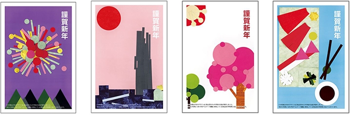 気仙沼の小・中学生デザイナーが制作したチャリティー年賀状の一部