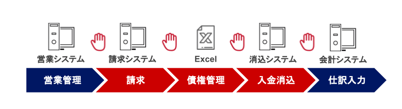 一般的に、営業担当が利用する営業支援システム(Sales Force Automation、以下SFA)と経理担当が利用する会計システムとの間には、請求に関わる面倒な業務が存在します。具体的には、SFAでは顧客・商談・受注に関わる営業管理まで対応しているものの、案件受注以降、会計システムに仕訳入力をするまでに「請求・債権管理・入金消込」という業務が発生します。freeeの調査(注によれば、68.2%の企業が紙/エクセルによる作業や請求書発行システムなど複数のツールと人力を駆使して請求業務を処理しており、非効率な業務フローと言わざるを得ない状況でした。