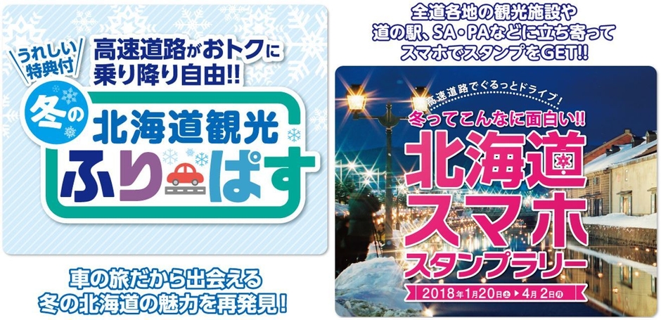 ウィンタースポーツや冬の祭典、温泉など、冬ならではの魅力あふれる北海道を、高速道路乗り降り自由の『冬の北海道観光ふりーぱす』と『冬ってこんなに面白い!!北海道スマホスタンプラリー』で、お得に楽しく満喫していただけます。