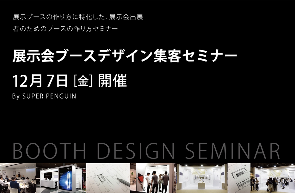 展示会のブースデザインを手掛けるSUPER PENGUIN株式会社(所在地:東京都品川区、代表取締役:竹村 尚久、以下 スーパーペンギン)は、東京ビッグサイトなどで行われる展示会へ出展する出展者に向けて「集客のできる展示ブースの作り方」に特化したセミナーを東京・銀座で2018年12月7日(金)に開催します。