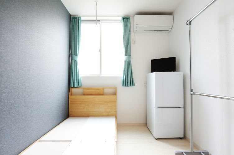 特徴 :シェアハウスの個室で、共有リビングがあります。リビングには、テレビ、冷蔵庫が設置されています。