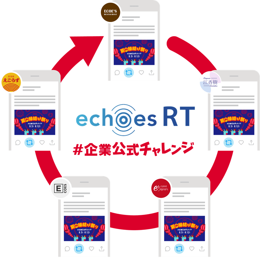 本キャンペーンは、企業間コラボレーションを通じた生活者との接点増加、およびコミュニケーション活性化を目的として、15の企業公式アカウントが同時に「夏の縁結び祭り」をテーマにechoes RTを活用したキャンペーンを開催いたします。