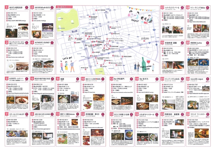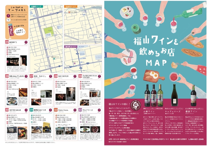 福山市や福山大学、福山商工会議所、ワイナリーを含む関係事業者で構成する備後ワイン振興協議会では「福山をワインの街に!」を合言葉に、地域にワイン文化を育てるため「福山ワインを飲めるお店MAP」を作成しました。