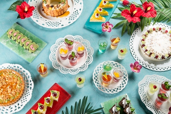 夏に嬉しい喉ごしよいゼリーやプリン、コールドパンで作る生アイスクリームを中心に、ミニケーキ、タルト、パイン、マンゴー、メロンなどのトロピカルフルーツもたっぷり。