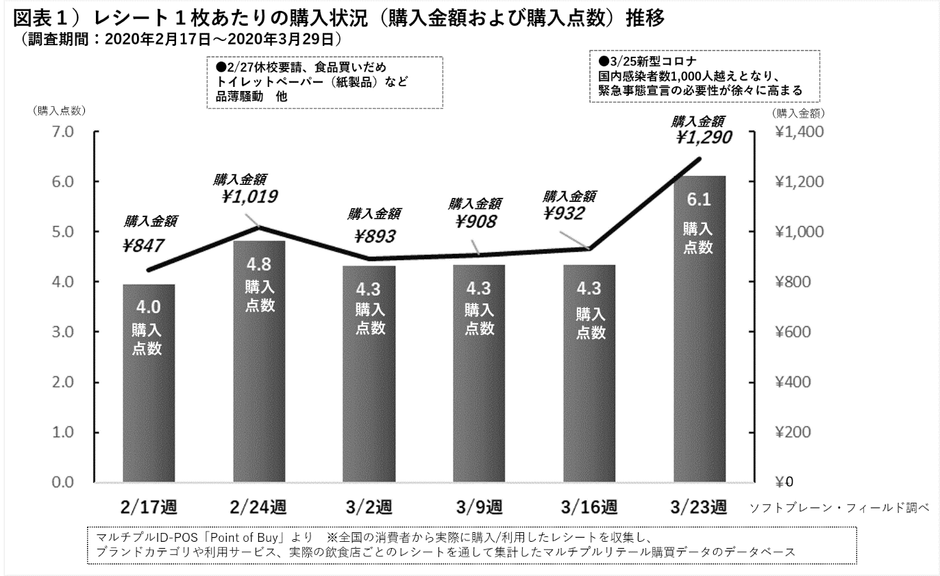 そこで今回は、フィールド・クラウドソーシング事業を展開するソフトブレーン・フィールド株式会社(本社:東京都港区、代表取締役社長:木名瀬博)は、全国のアンケートモニターから独自に収集する「マルチプルID-POS購買理由データPoint of Buy(R)」(以下POB)から、購買行動を分析しました。調査期間は、2020年2月1日~3月31日で、期間中の購入レシート総枚数は、約56万枚です。