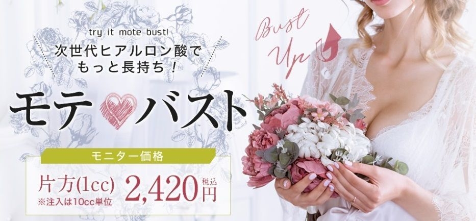 モテバストは、腋窩部もしくはバスト周囲の目立ちにくい部位からヒアルロン酸を注入する20分程度の施術です。術後のダウンタイムが従来よりも少なく、当日よりシャワーも可能です。