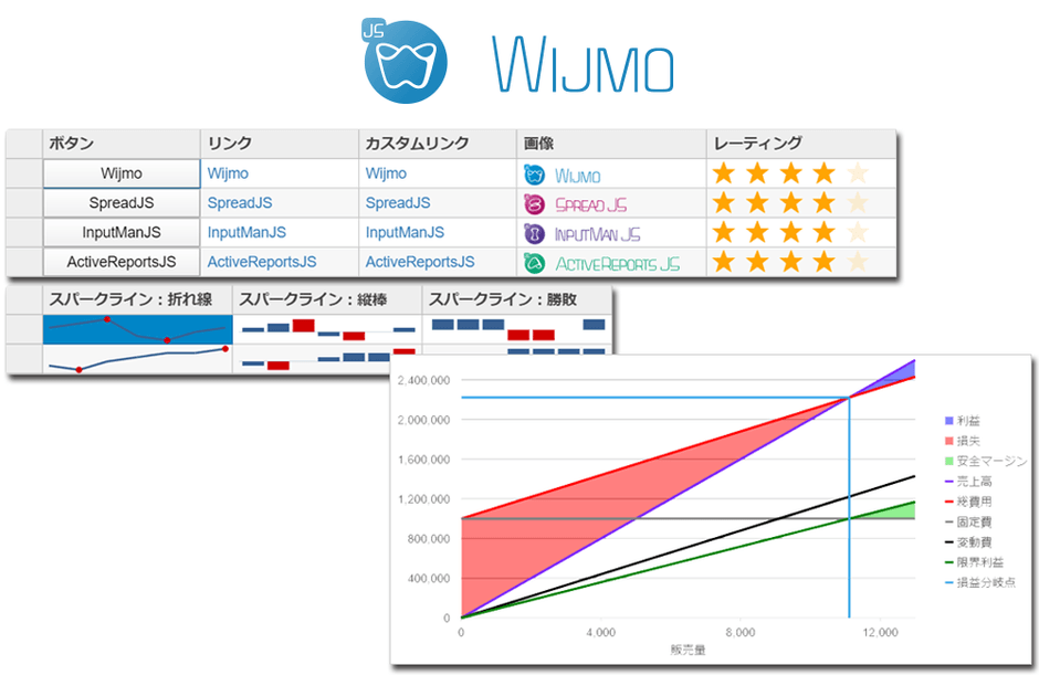 例えば、ボタンやハイパーリンク、画像などをセルに表示できる「カスタムセルの生成」機能を「FlexGrid」に追加しました。セルの表示内容をさまざまな要件に合わせてカスタマイズできます。加えて、「チェックボックスで列を選択」や「ラジオボタンセルの表示」など、多くの機能を搭載しています。さらに、80種を超えるチャートタイプで訴求力の高いデータを表示する「FlexChart(フレックスチャート)」に、損益分岐点チャートを表示できる機能を追加しました。
