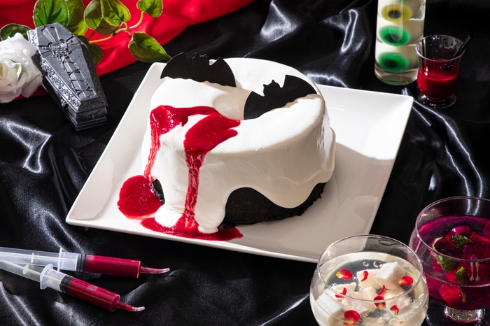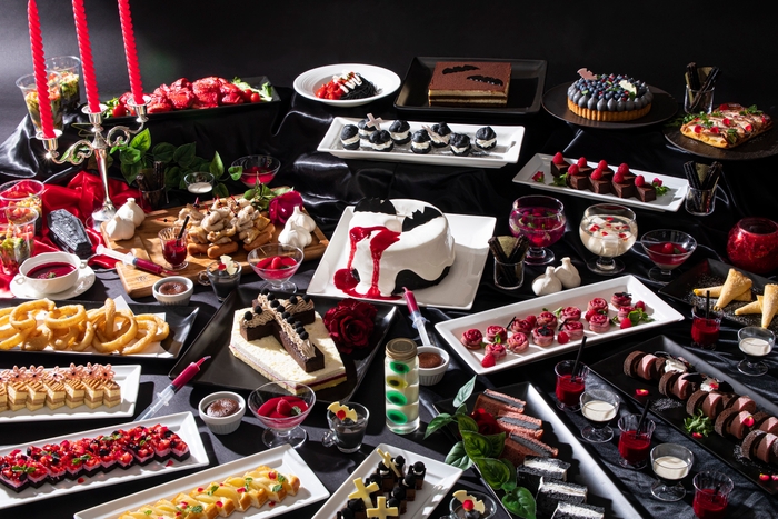 今回は、黒をベースとして赤いベリーソースを引き立たせたスイーツや料理で“ブラッディ”な雰囲気を作り上げ、また棺や十字架、コウモリなどをかたどって、ヴァンパイアの世界観を表しています。店内は古城の画や妖艶な赤いバラなどで装飾し、雰囲気を盛り上げております。