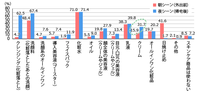 また、朝シーンと夜シーンで最も差がでたのは※「クリーム」でした。「朝シーン(15.9%)」に対し、「夜シーン(31.7%)」と15.8 ポイント差でした。(※クレンジング、洗顔料、日焼け止めを除く)