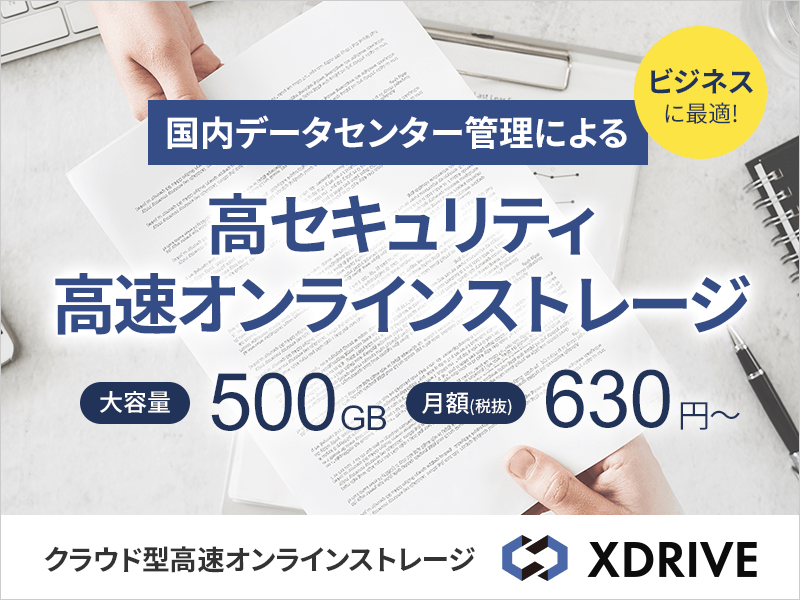 『XDRIVE』は、大容量500GBで初期費用無料、月額630円(税抜)からご利用いただけるクラウド型の高速オンラインストレージサービスです。
