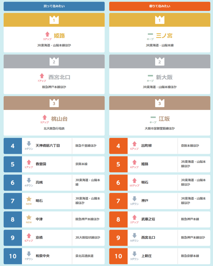 近畿圏借りて住みたい街ランキングは、1位が「三ノ宮」、2位が「新大阪」、3位が「江坂」と前回の調査結果と全く同じ顔ぶれとなりました。4位には前回9位の「出町柳」、5位には「買って住みたい街」ランキングで1位になった「姫路」が前回の11位から大きく順位を上げてベスト10入りしています。詳細は結果をご覧ください。