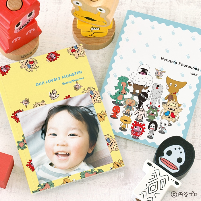 元気な黄色を背景に「ピグちゃん」「カネちゃん」「ダダちゃん」など、こどもかいじゅうがごろんごろんと寝転んでいるようなパターン柄デザインです。表紙に写真を入れられます。