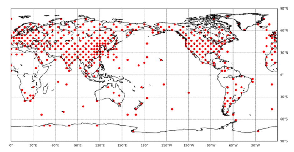 図1 世界におけるラジオゾンデ観測地点:信頼性高く、各高度での気温、圧力、風速等を得るために用いられるラジオゾンデ観測(ゴム気球による大気観測)は、気象シミュレーションの計算グリッド(数km~数10km)に対して疎らである。