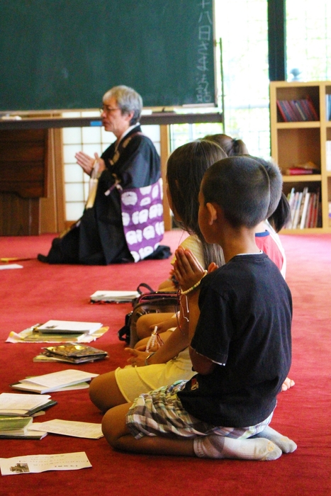 「お寺の階段を上がったところで合掌」「本堂に入る時はお辞儀」など「お寺でのお約束(伝統的作法)」に則った立居ふるまい。入る時から出る時まで、きっちりこなします。そして本堂では僧侶に従い、きちんと正座、元気に読経します。毎日の暗唱試験があり、一文字でも間違えると不合格。修行期間も中盤になると、40名を超える子供たちが難しい「歎異抄(たんにしょう)」や聖徳太子の「十七条憲法」、漢文などを朗々と暗唱します!