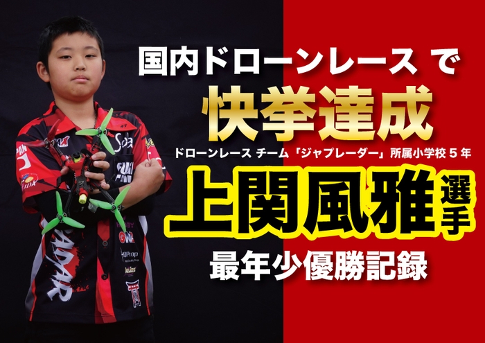 株式会社アクティブガジェットが運営するドローンレース チーム「JAPRADAR(ジャップレーダー)」※に所属する上関 風雅選手は、小学3年生からドローンレースを本格的にはじめ、これまでも国内外でのレースに積極的に参加し数々の大会でも入賞をしてきましたが、2019年5月に開催されたJAPAN DRONE LEAGUE 第2戦PROクラスで樹立した初の最年少優勝記録に加えて、2019年8月に神奈川県で開催された国際大会において、世界トップクラスのパイロットを破り見事優勝。二つ目の「国内ドローンレース 最年少優勝記録」を打ち立てる事となりました。