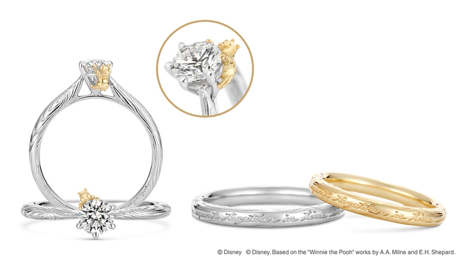 2016年8月には初めて「くまのプーさん」の婚約指輪、結婚指輪「Winnie the Pooh “Sweet Honey”」を発売。「ハチミツ」と「愛しい人」の意味を掛けた“Sweet Honey”は、身に着ける人が甘くて素敵な時間を過ごせますようにと願いがこめられています。
