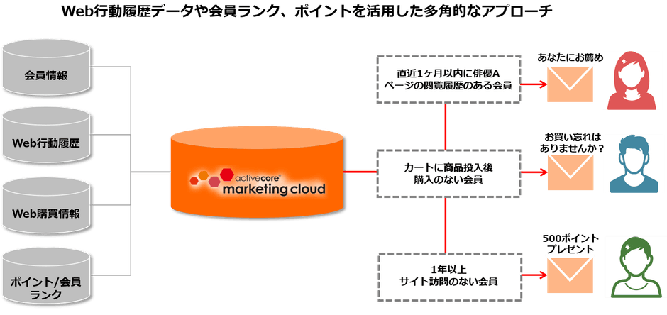 「activecore marketing cloud」を導入し、過去の購買実績とともにWeb行動履歴データを活用することで、会員一人ひとりの直近の興味関心からお薦め商品を訴求するレコメンドメール、カートに商品を放置している会員に対するカート落ちメールの実施が可能になりました。さらに、会員ランクや保有ポイントを活用することで、過去1年以上サイトへアクセスがない会員にのみポイント付与を行う休眠掘り起しメールの配信や保有ポイント数の多い会員に対して高額商品に絞ったレコメンドメールを配信するなどの施策が実現できるようになります。