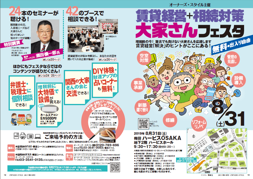 大家さん向け専門の出版社である株式会社オーナーズ・スタイル(所在地:東京都中央区、代表取締役:上田 英貴)は、空室の増加など賃貸経営を取り巻く昨今の厳しい環境において、家主・地主のお悩みを解決するために、大家さんだけを対象とした関西最大級のイベント、「賃貸経営+相続対策 大家さんフェスタin梅田」を8月31日(土)に開催いたします。