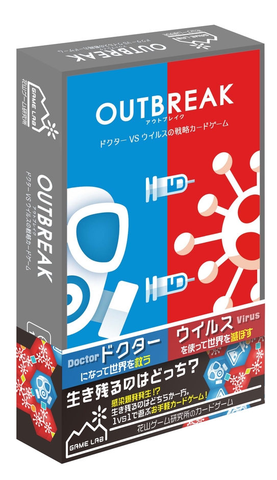 『アウトブレイク』は、菌と医療の対決をテーマにしたカードゲームです。プレイヤーは菌と医療に分かれて交互にカードを場に出してつなげていきます。菌のカードを7枚つなげるか、カードが無くなるまで逃げ切れば菌プレイヤーの勝ち、菌を完全に包囲できれば医療プレイヤーの勝ちとなります。今までにない新しいアイデアのカードゲームです。