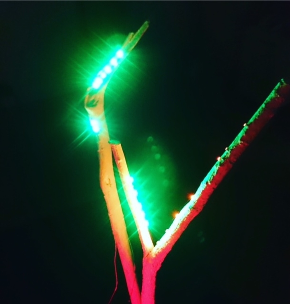 木の枝に【SOLDINE】で回路形成・LED実装して制作した照明