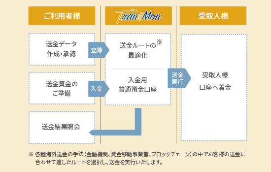 Tran$Monは独自のシステムにより、お客様の送金ニーズに合わせ、すでに安全性が確立された各種海外送金の手法(金融機関・資金移動事業者・ブロックチェーン等)から送金ルートを最適化し、従来海外送金の1/4程度の利用料金、スピーディな着金を実現することで、利用者様の利便性を飛躍的に向上させました。さらに世界中の金融機関へ送金でき、個人ユーザーから法人まで様々な海外送金のニーズに応えることが可能となりました。