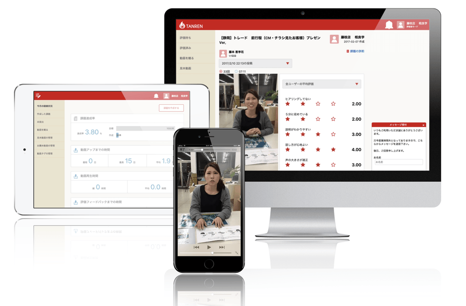 TANRENは、接客ロールプレイング(ロープレ)の動画をクラウド上で共有し、マネージャーや同僚がその動画に対して詳細なフィードバックができるナレッジシェアアプリです。販売スタッフ等がロープレの動画をスマホやタブレットで撮影しクラウド上にアップロードできます。マネージャーや同僚などの評価者がオンラインで再生・フィードバックをするシンプルな工程で社内教育を進めることができます。クラウド上で閲覧・評価が完結することで、時間や場所にとらわれず、より効率的・効果的な社員教育が可能となるだけでなく、組織全体にナレッジ(ノウハウ)をシェアすることができます。
