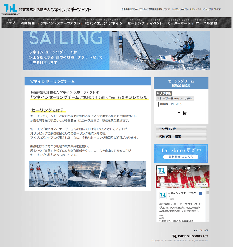 特定非営利活動法人ツネイシ・スポーツアクト(所在地: 広島県福山市沼隈町中山南26-1、理事長:田中真悟)は、2017年1月に発足した「ツネイシセーリングチーム(TSUNEISHI Sailing Team)」のウェブページを公開しました。ページでは、ナクラ17級のご紹介や、公式試合や強化トレーニングで参加する大会情報の予定・結果などの活動をお伝えしています。