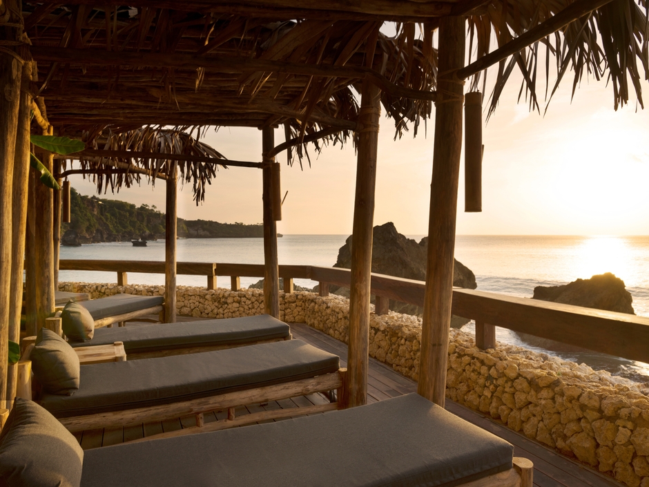 クブビーチクラブはアクアマリンの海に壮大なライムストーンのクリフを背景に、バリの昔ながらの建築様式で建てられており、貝殻や木材、竹や石など伝統的な自然の素材をふんだんに使用、屋根はヤシの葉に相当する「ロンター」の葉で葺かれています。懐かしさを覚える木製のバーカウンターは、干したとうもろこしやココナッツのバスケット、貝殻などノスタルジックなアイテムが配され、どこか気持ちが安らぐように感じることでしょう。