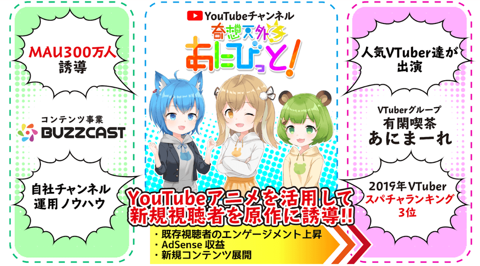 株式会社BUZZCAST(代表取締役CEO:山田 雄介、以下 BUZZCAST)は、自社で運営しているチャンネルでMAU300万を達成したノウハウを基に774inc.が運営するVTuberユニット「有閑喫茶あにまーれ」のキャラクターが出演するYouTubeアニメ動画チャンネル「奇想天外あにびっと!」を開設し配信開始したことをお知らせいたします。