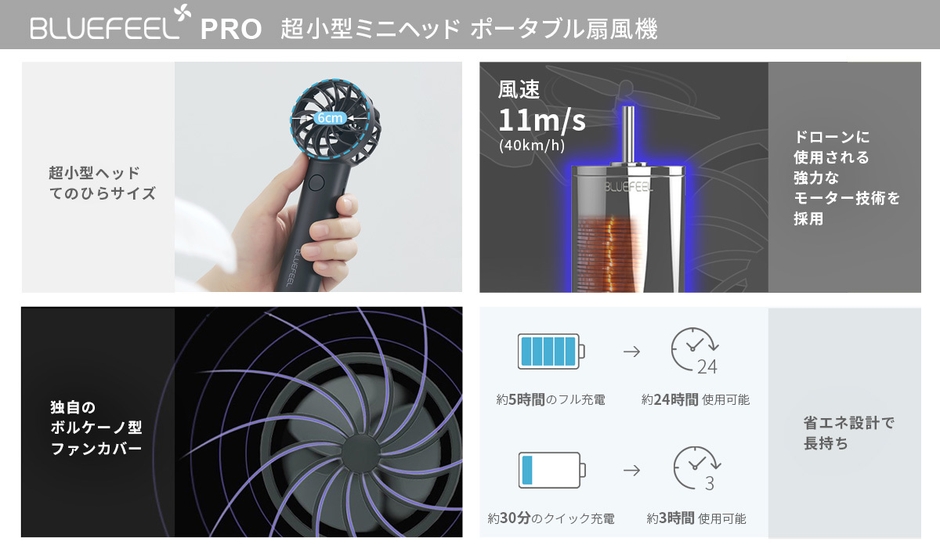 6cm超小型ヘッドで最大風速11m/sのポータブル扇風機「BLUEFEEL PRO」新発売