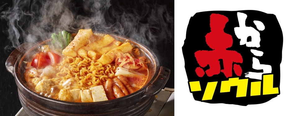 ▲左:看板メニュー「ソウル鍋」(1人前・税込1,408円、※1人前より注文可能)。右:「赤からソウル」ロゴ