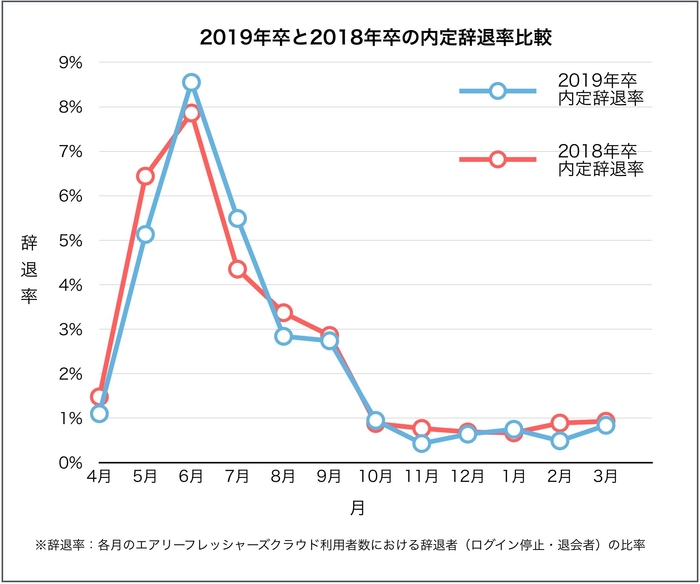 また、6月の辞退率が約8.55%となり、昨年と比べ約0.7ポイント上昇しており、早期に内定を保有しつつも、承諾の意思決定は6月まで保留する傾向があることがわかります。