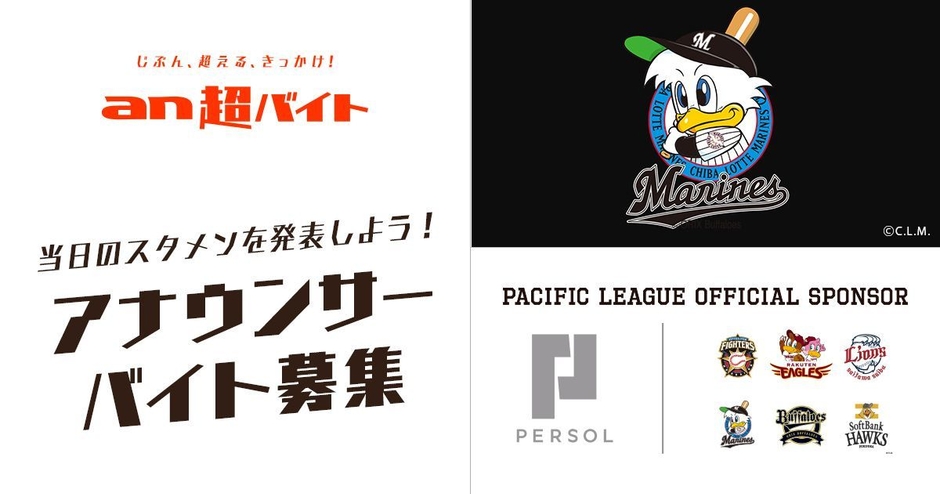総合人材サービス、パーソルグループのパーソルキャリア株式会社(旧社名:インテリジェンス、本社:東京都千代田区、代表取締役社長:峯尾 太郎)が運営するアルバイト求人情報サービス「an」< https://weban.jp/ >は、思わず挑戦してみたくなるような「an超バイト」の新企画として、9月16日(日)14:00~ZOZOマリンスタジアムにて行われる「千葉ロッテマリーンズvs東北楽天ゴールデンイーグルス」の試合で場内放送にてスタメン発表を行っていただく、“アナウンサーバイト”を1名募集します!報酬は、日給5万円を支給。さらにサイン入りグッズと試合観戦チケットもプレゼントします。
