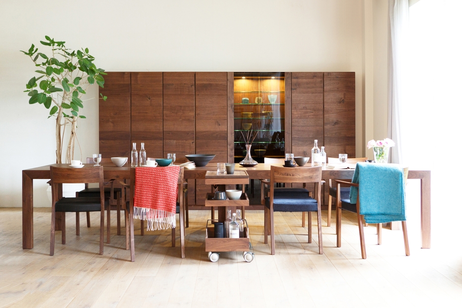使い込まれた道具と機械で一つ一つ生産する職人気質なメーカーですが、作り出される製品はミニマルで洗練された意匠を誇ります。無駄な装飾は排し、ウォールナットやオークといった素材の木目や節を活かしたデザインは、極めて現代的で落ち着いた印象。そして、これまでの生活様式を根底からくつがえす様な新たな機能性を持ったプロダクトを生み出しています。白い壁とフローリングの空間にマッチするその佇まいから、木の持つあたたかな素材感と、本物が醸し出す存在感を日常生活に取り入れたいと望む都会のユーザーからも高い支持を得ています。