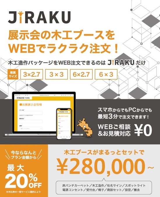 展示会のブース装飾などを行うジラフ計画が、 展示会出展社向けの木工ブースWEB注文サービス 「JiRAKU」の新プランをリリース