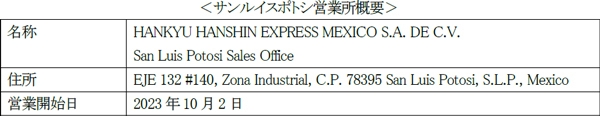 当社メキシコ法人であるHANKYU HANSHIN EXPRESS MEXICO S.A. DE C.V.は、メキシコ中央高原エリアのサンルイスポトシ市に新たに営業所を開設し、10月2日より営業を開始します。
