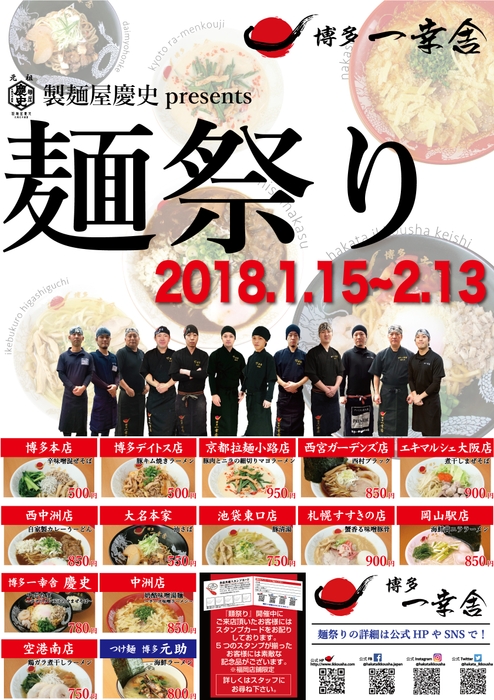 麺の美味しさを広めるため、博多一幸舎≪麺祭り 2018≫を 全国14店舗にて1月15日~2月13日 開催決定