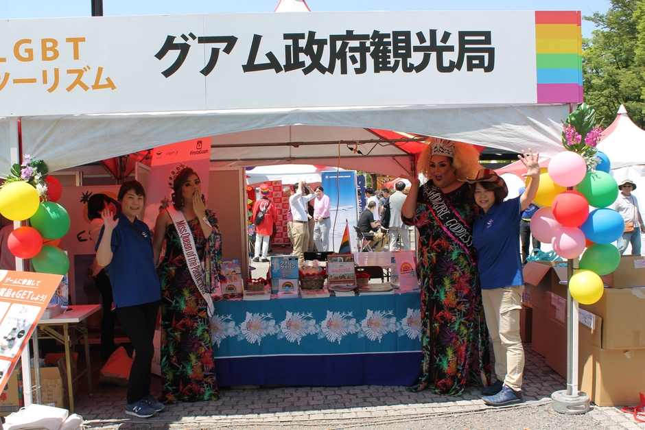 同イベントに先立ち、グアム政府観光局では、5月5日(土)、6日(日)の2日間に約15万人が参加して開催された『東京レインボープライド2018』(主催:特定非営利活動法人 東京レインボープライド)にブース出展し、「グアム・プライド2018」の告知を行いました。LGBTツーリズムコーナーのグアム政府観光局ブースには、グアムから来日した「ショーガール・ゴッデス2013」のウィリアム・“ウィルマ”・ドゥエナスと「ミス・グアム・オブ・ザ・パシフィック2015」のカイル・“カイリー”・ドゥエナスが華を添え、数多くの来場者と交流を図りました。ウィルマとカイリーは、グアムのICONというクラブで毎週木曜日に開催されるGENDER BENDERというイベントにパフォーマーとして参加しています。