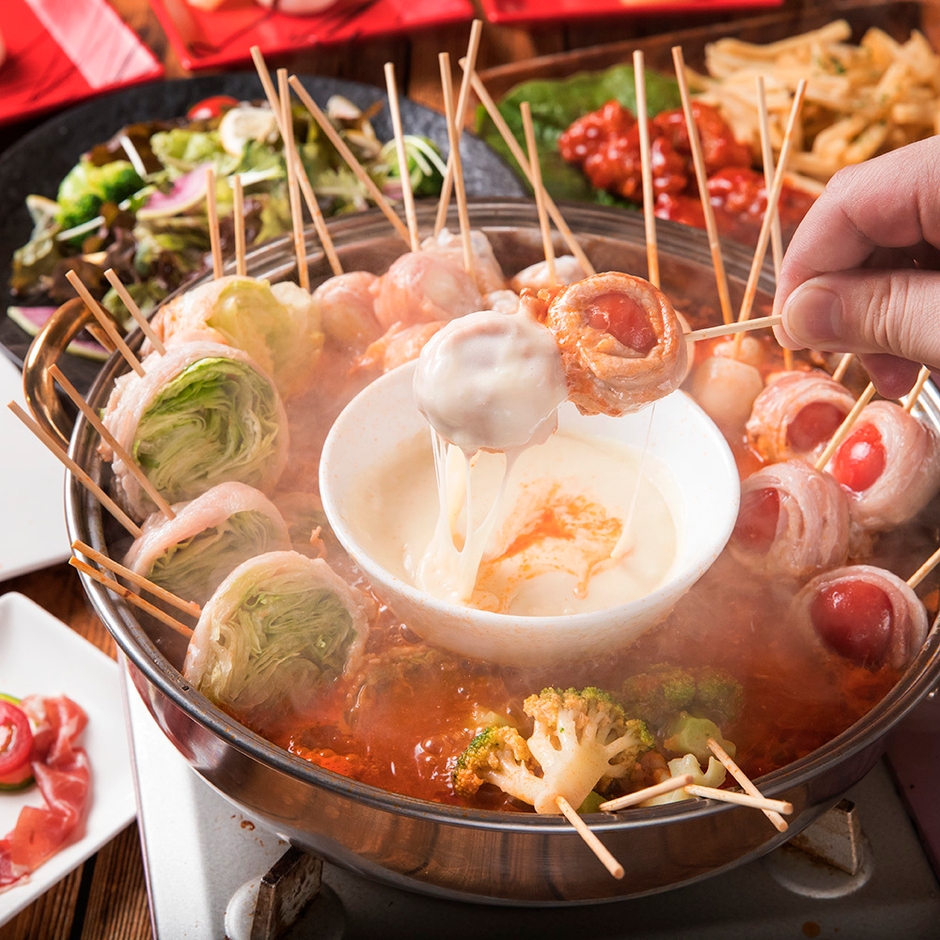 トマトベースのスープにたっぷりの肉巻き串を煮込み、北海道産牛乳で仕上げたチーズにドボンとつけて食べるチーズフォンデュ鍋。野菜やお肉のうまみが溶け出したスープとチーズの濃厚な味わいが絶妙にマッチしたチーズ鍋です。