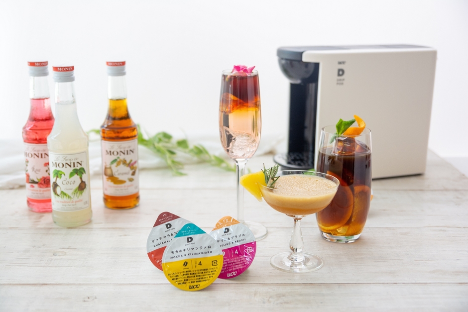 『ドリップポッド 旅するコーヒーモクテルセット』は、夏に向かうにつれ感じる開放的な気分とは対照に昨今「おうち時間」が増える中、自宅にいながら、お出かけやバカンスなど夏らしいイベントを楽しんでいる気分を味わえる数量限定のセット商品です。フランスのトップシロップブランド「モナン」とUCCがオリジナルのモクテル&カクテルレシピを共同開発しました。産地により異なる味わいを持つコーヒー豆の特長を引き立てるコーヒーモクテルを通じて、コーヒーの新たな一面を楽しむ提案をします。