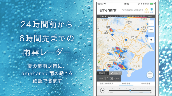 夏の大雨対策に!無料天気予報アプリ『amehare』から 24時間前から6時間先までの高詳細“雨雲レーダー”を提供開始