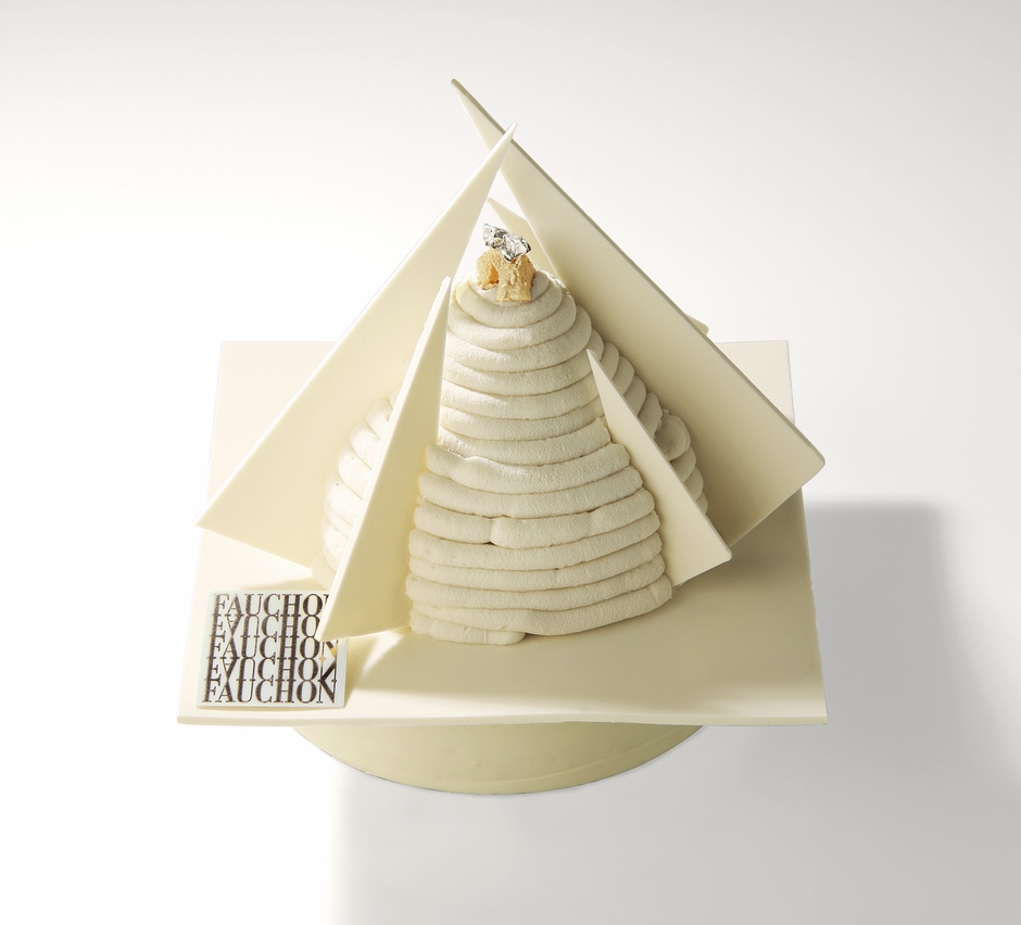 日本でも根強い人気を誇るモンブランをフォションスタイルで進化させ、クリスマスツリーをスタイリッシュにシャープに模った純白のクリスマスケーキです。聖なる夜に雪が降り積もるクリスマスツリーをイメージし、“モンブラン=白い山”の名前そのままに、真っ白に、かつアール・デコ調にデコレーションしました。